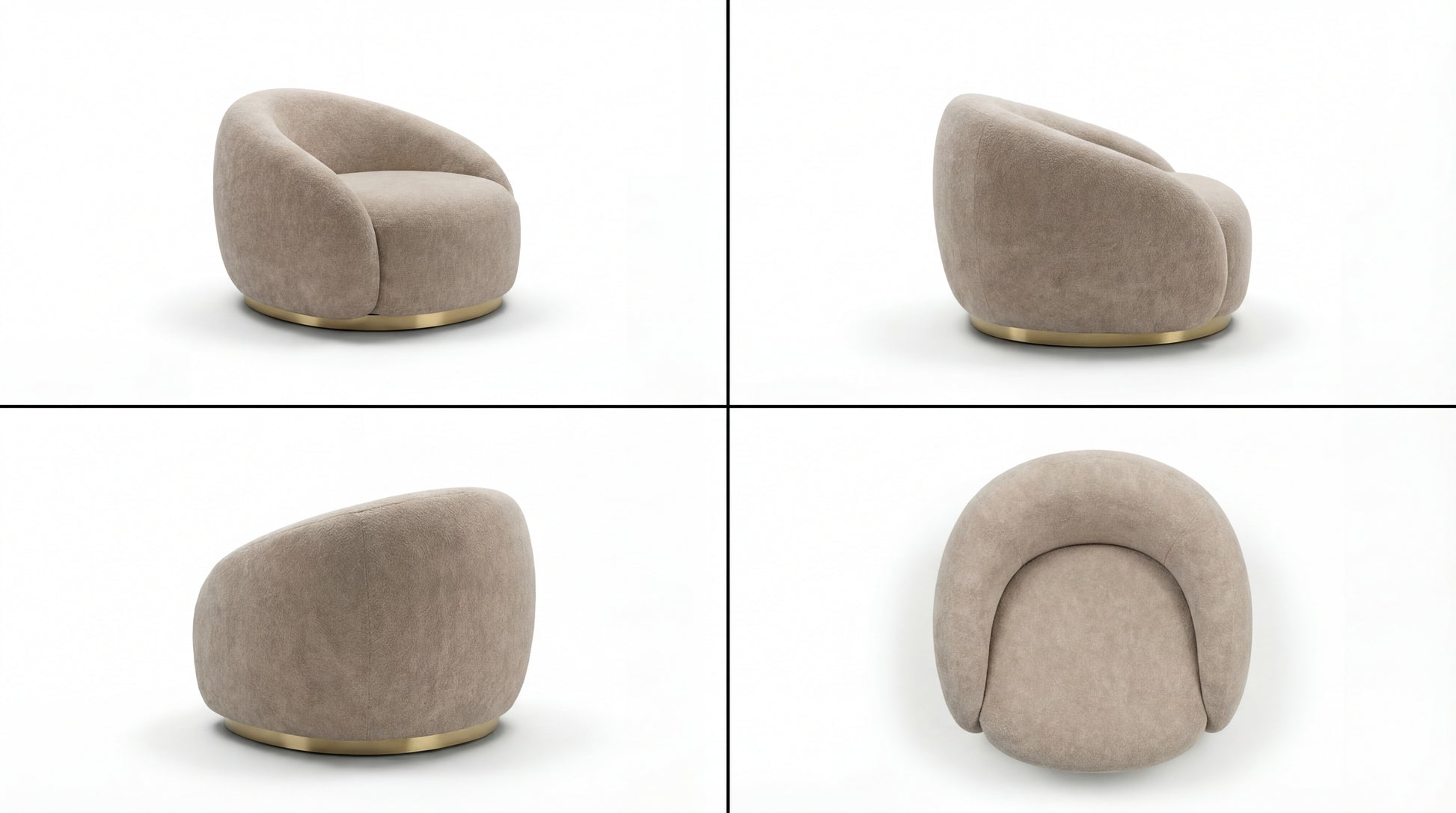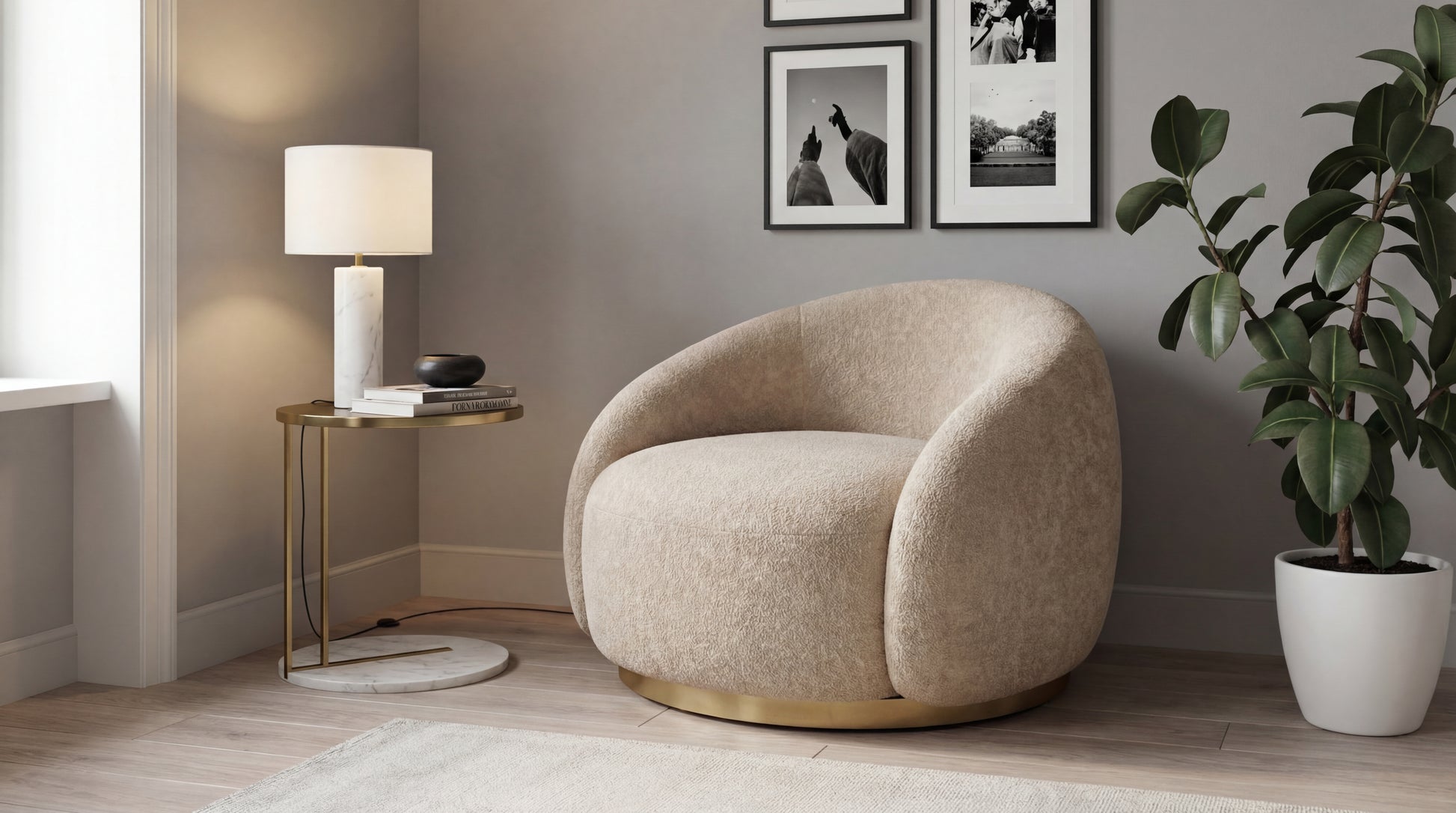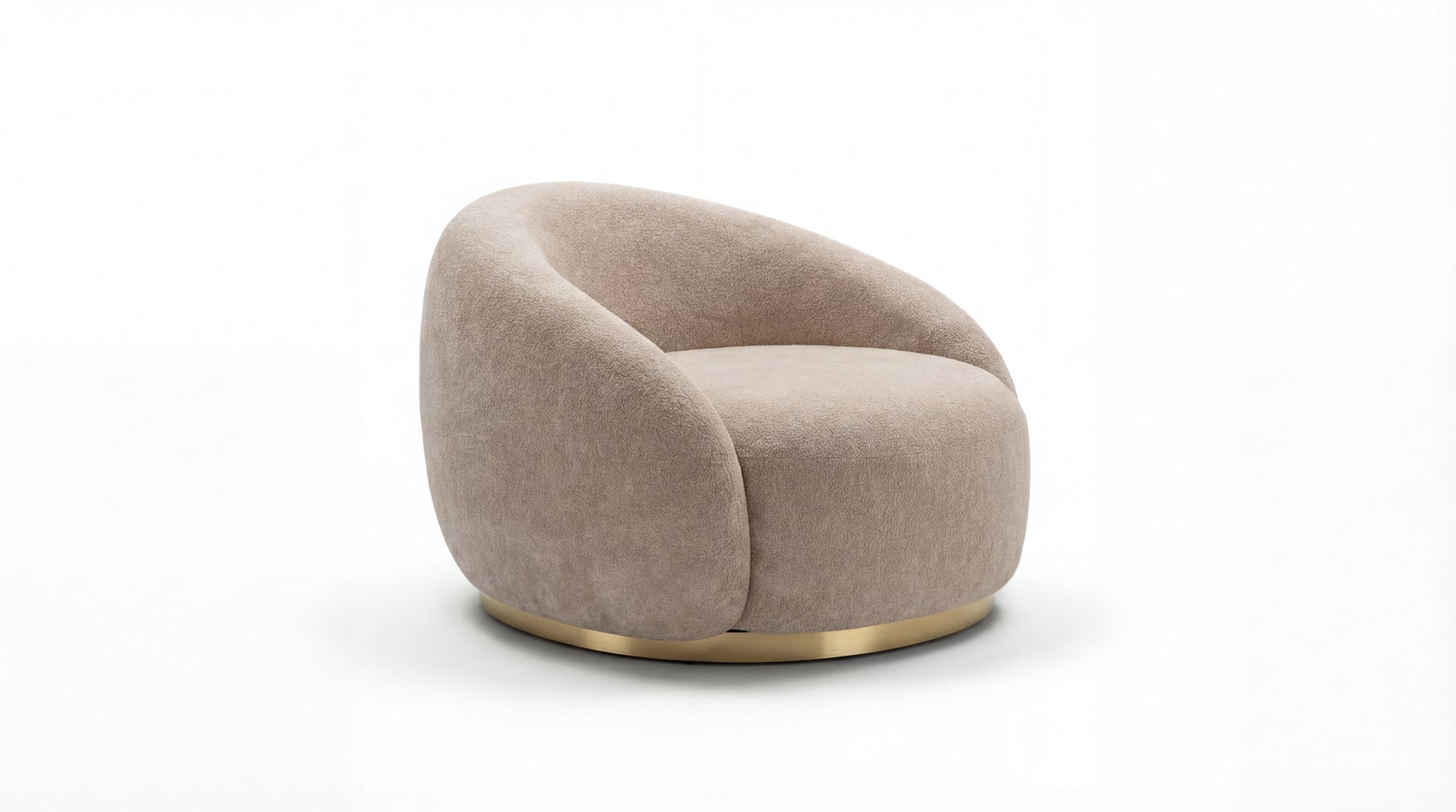 A refined accent chair with a soft, wraparound silhouette designed for cozy, supportive seating. The rounded backrest gently embraces the body, while the generous seat keeps the profile compact yet comfortable. Finished with a slim metallic ring base, it adds a subtle touch of luxury and a clean, contemporary look—ideal for living rooms, bedrooms, or reception spaces.