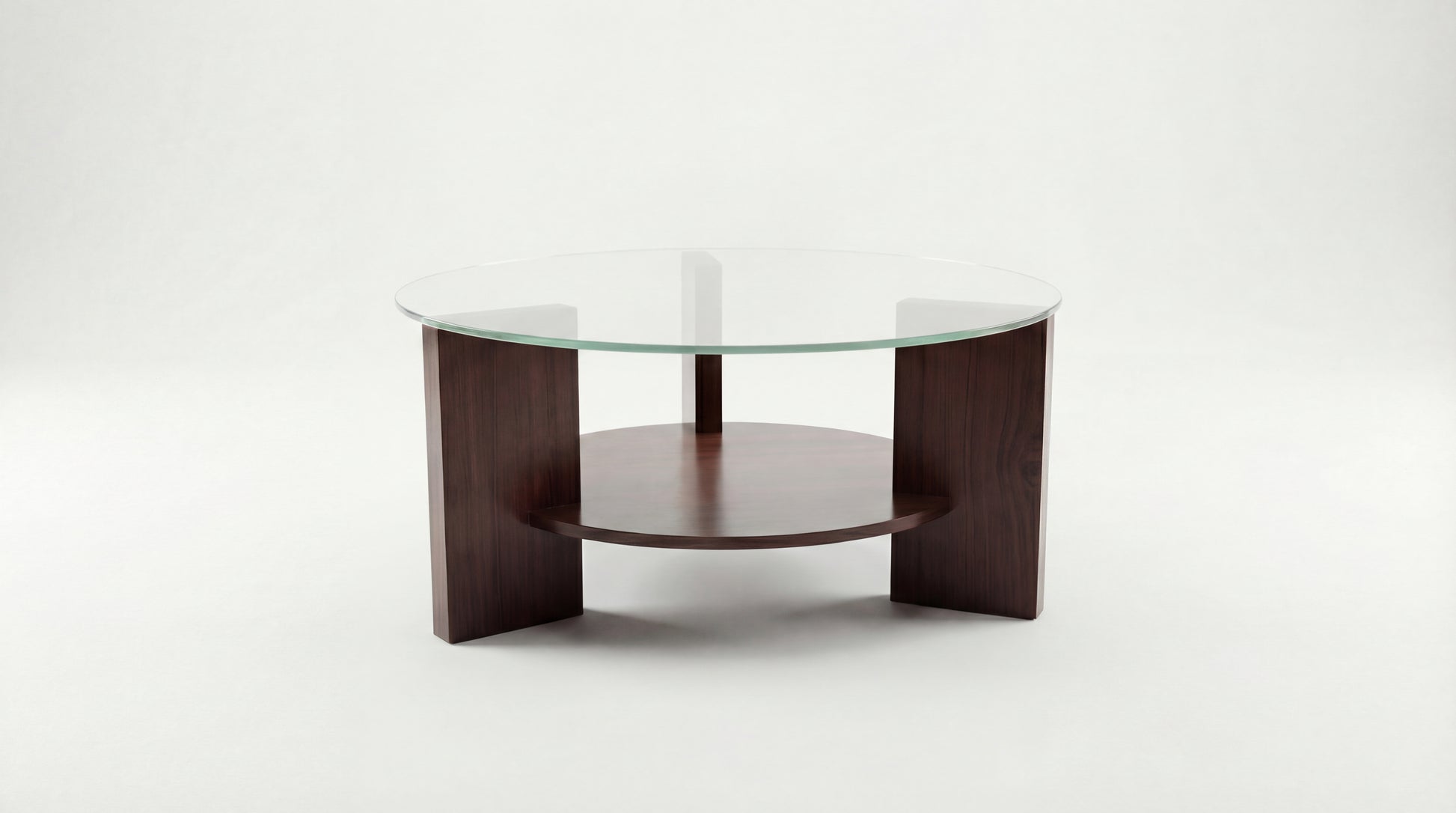 This round coffee table balances lightness and structure with a clean, architectural silhouette. A clear glass top creates an airy, open feel—keeping the space visually calm—while the warm wood base adds depth and stability. The integrated lower shelf provides practical storage for books, trays, and everyday essentials, keeping the surface clean and styled.
