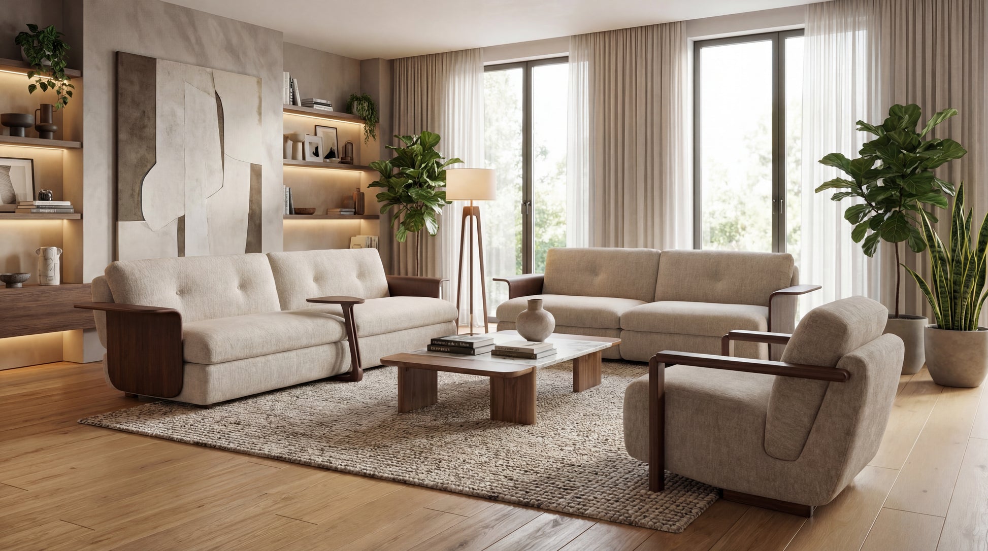 Modern interiors that blend natural materials with clean lines—where wood warmth and contemporary comfort meet in one cohesive space.