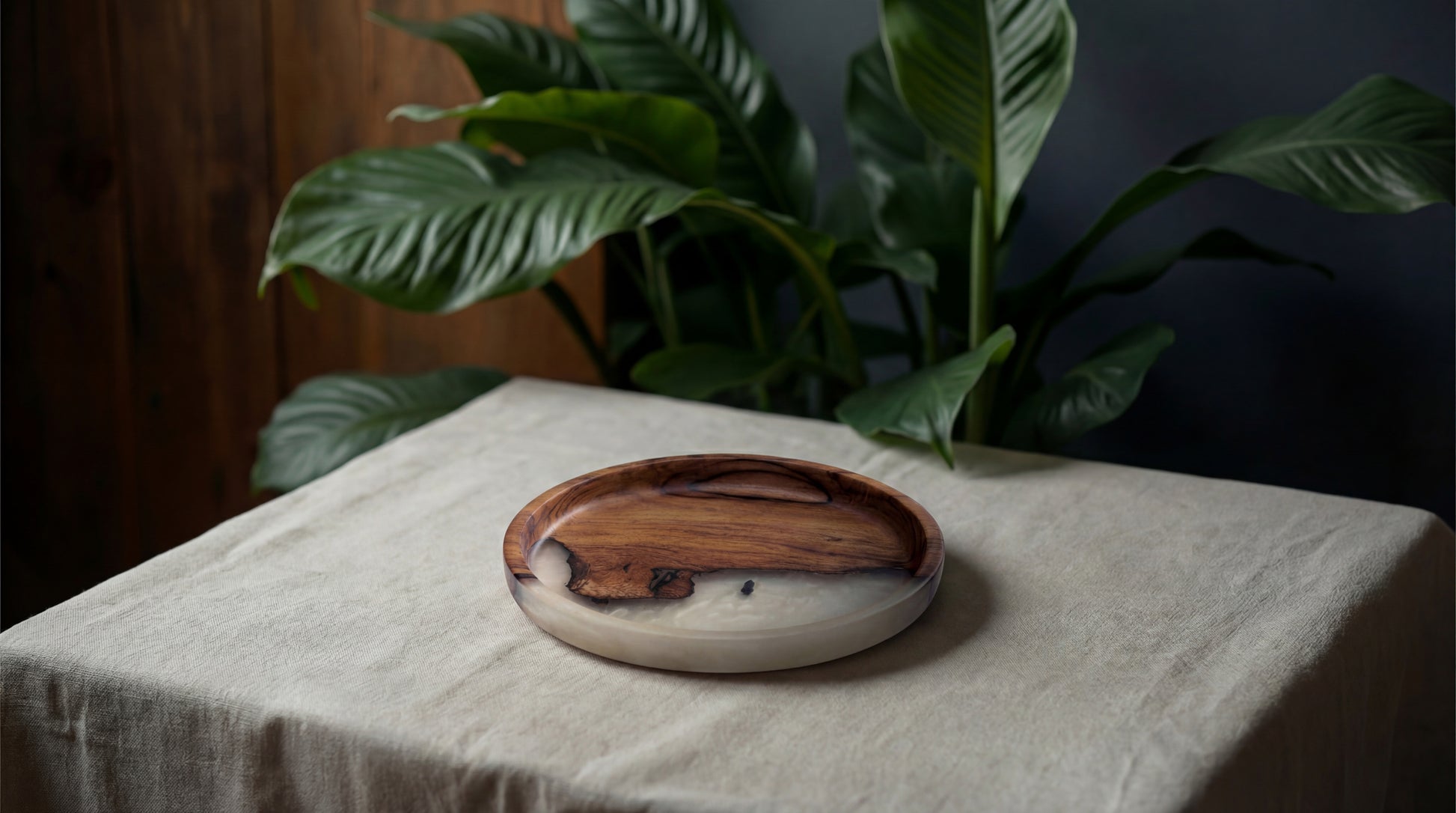 The Lignum Resin Plate – Small captures the same natural artistry in a more versatile, everyday size. The contrast between warm wood tones and soft resin gives each piece a calm, earthy presence that blends seamlessly into modern interiors.