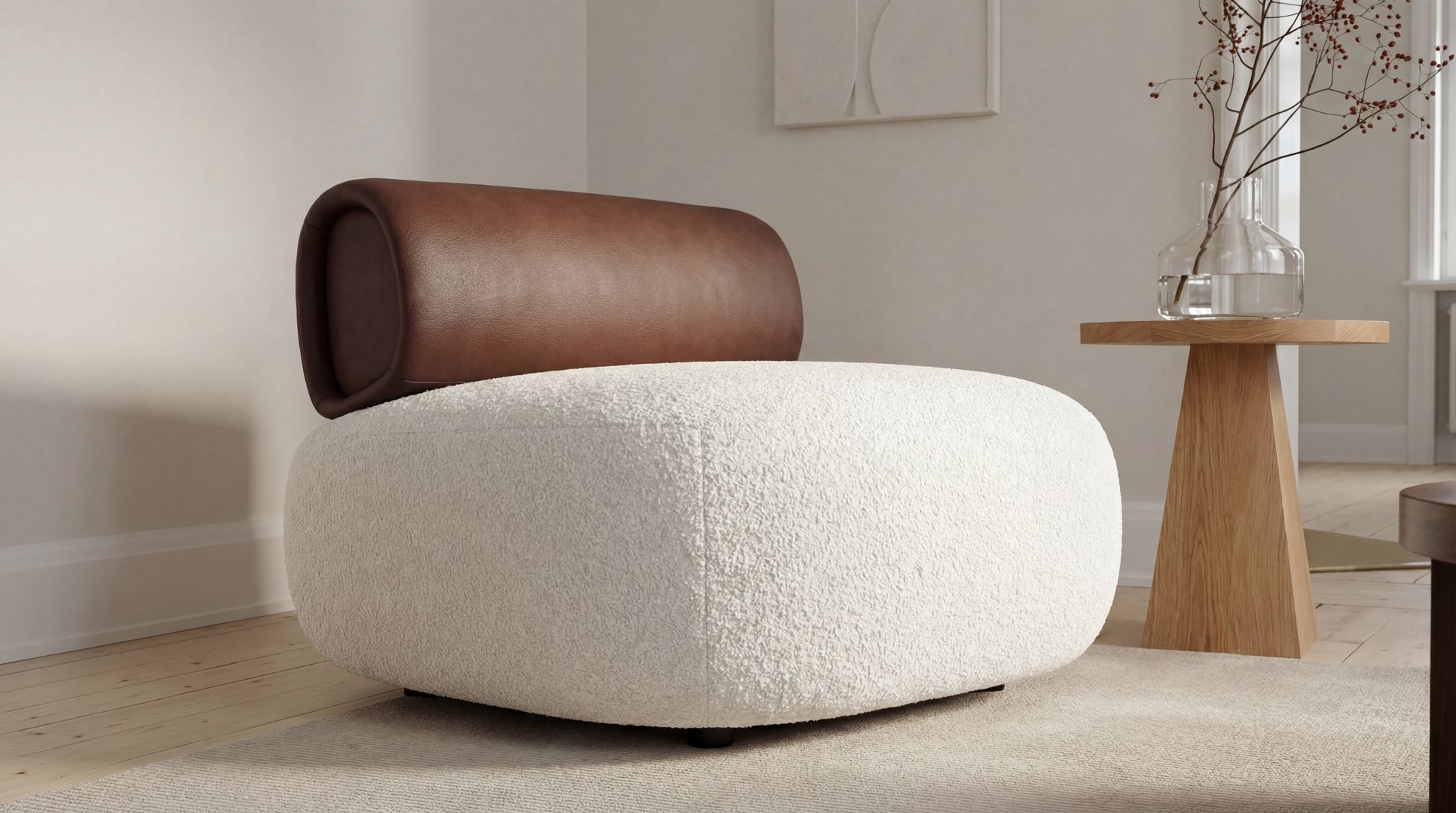 A modern accent chair defined by a soft, rounded silhouette and a bold material contrast. The generously cushioned seat is upholstered in textured off-white fabric for a warm, inviting feel, while the backrest is finished in leather—a refined detail that adds depth, character, and a premium touch. Compact yet expressive, it works beautifully in living rooms, bedrooms, or boutique reception corners.