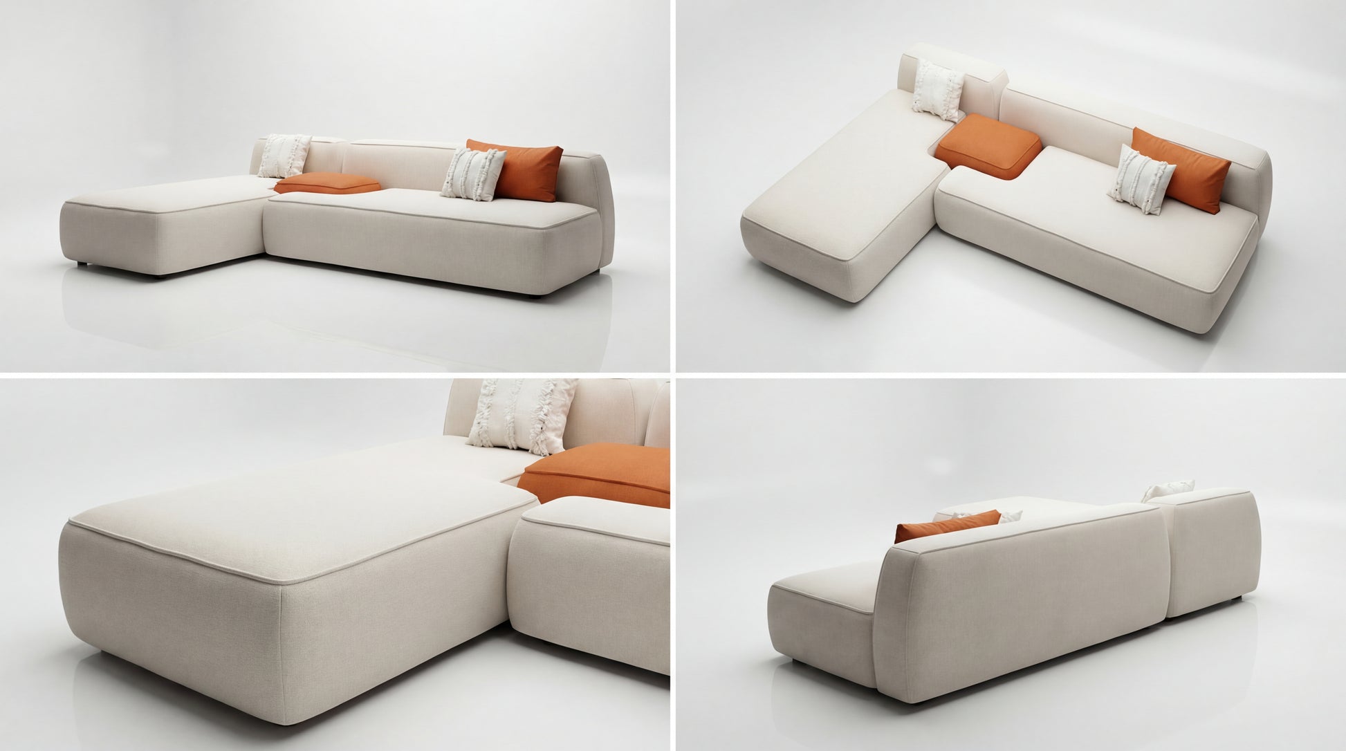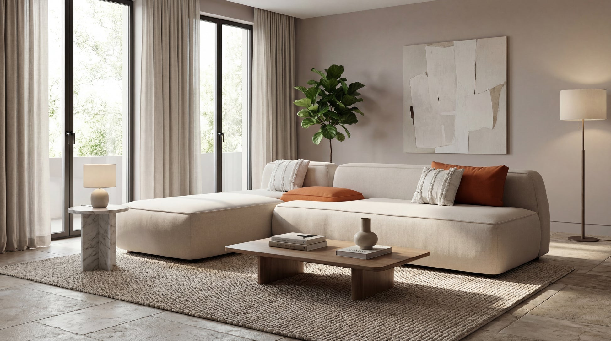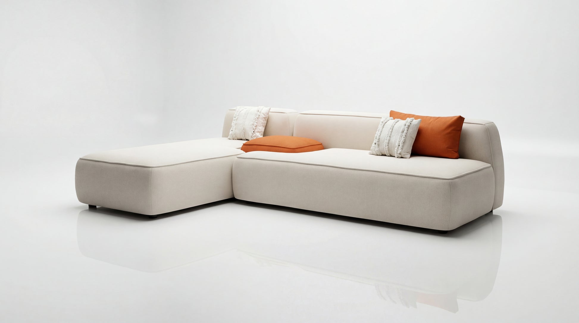 This L-shaped sofa is defined by quiet elegance and effortless practicality. With its clean, softened silhouette and generous lounge section, it creates a harmonious setting where comfort feels refined and the space stays calm, modern, and inviting—perfect for everyday living and relaxed hosting.