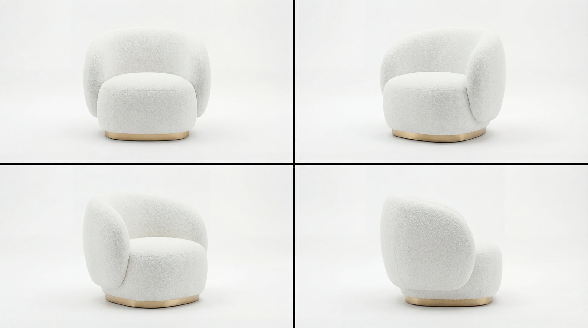 A sculptural swivel-style accent chair defined by soft, rounded geometry and a clean, seamless silhouette. Its wraparound backrest and gently contoured seat create a cozy, supportive sit, while the slim metallic ring base adds a refined touch and a light visual finish. Upholstered in textured off-white bouclé, it blends warmth and quiet luxury—ideal for modern living rooms, bedrooms, and reception spaces.