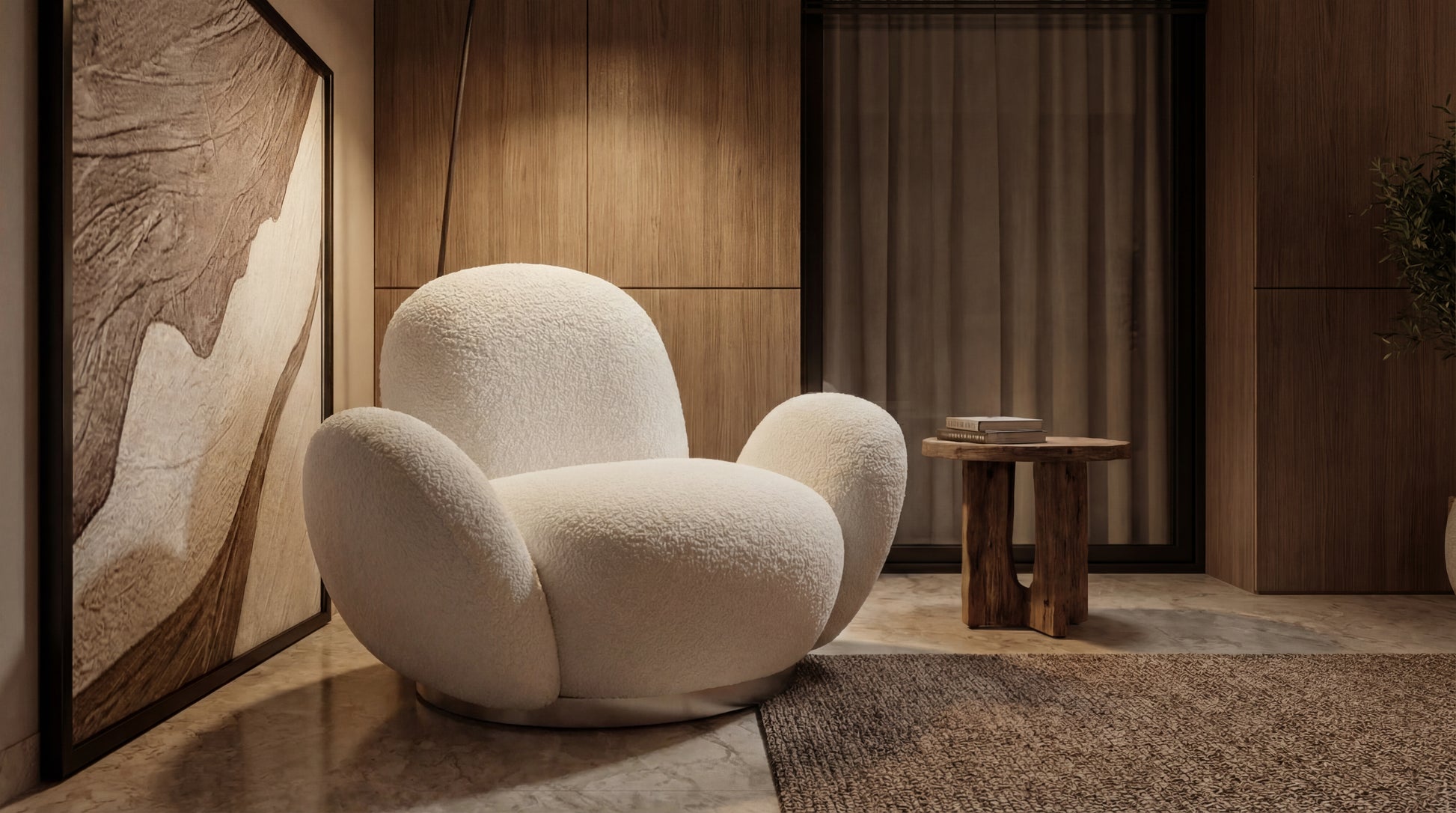 A sculptural accent chair designed with bold, rounded volumes and an embracing silhouette. The oversized curved arms wrap around the seat to create a cozy, supportive posture, while the low circular base gives the chair a clean, grounded presence. Upholstered in textured off-white bouclé, it adds warmth and quiet luxury—perfect for living rooms, bedrooms, or refined reception corners.